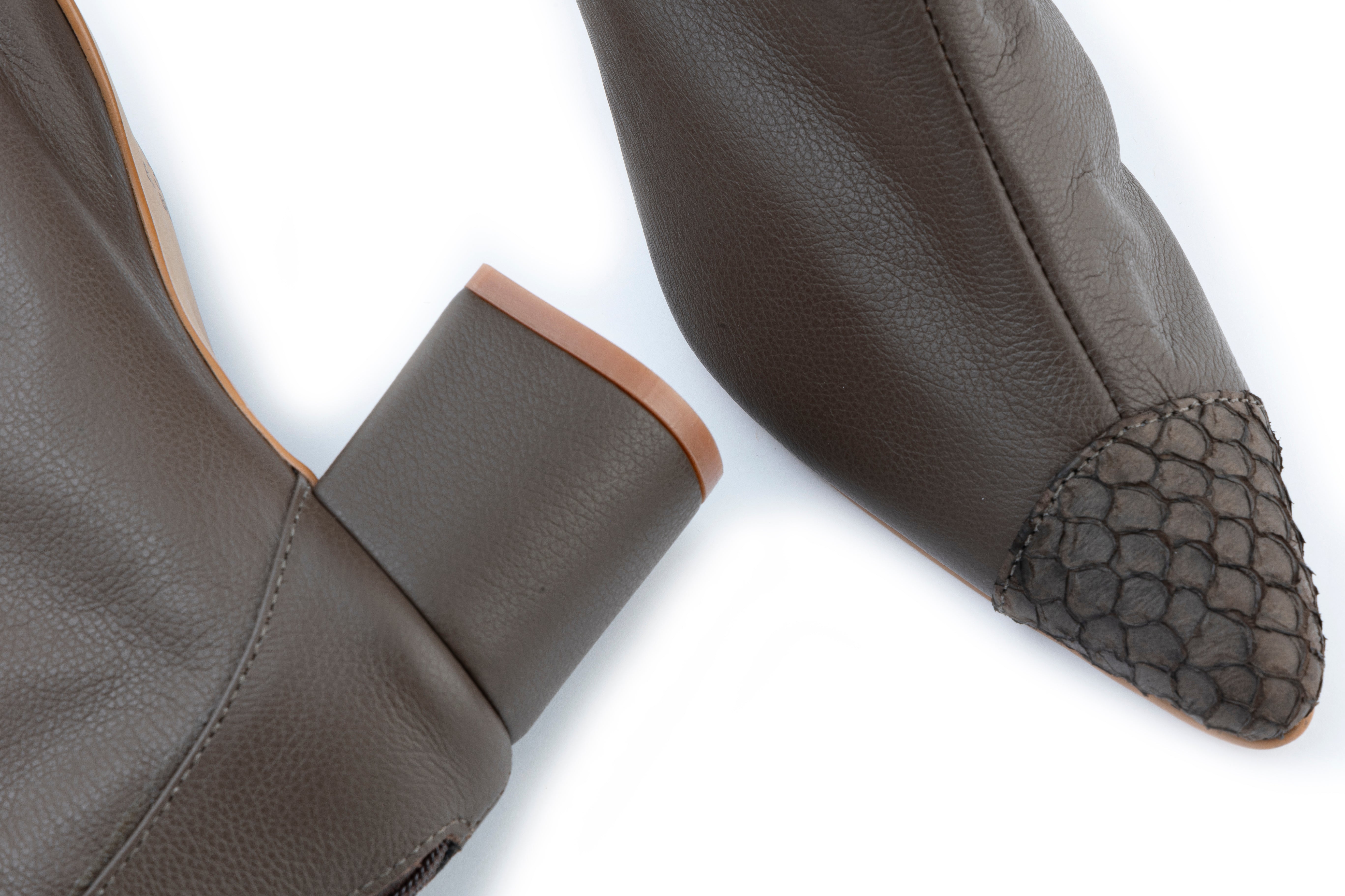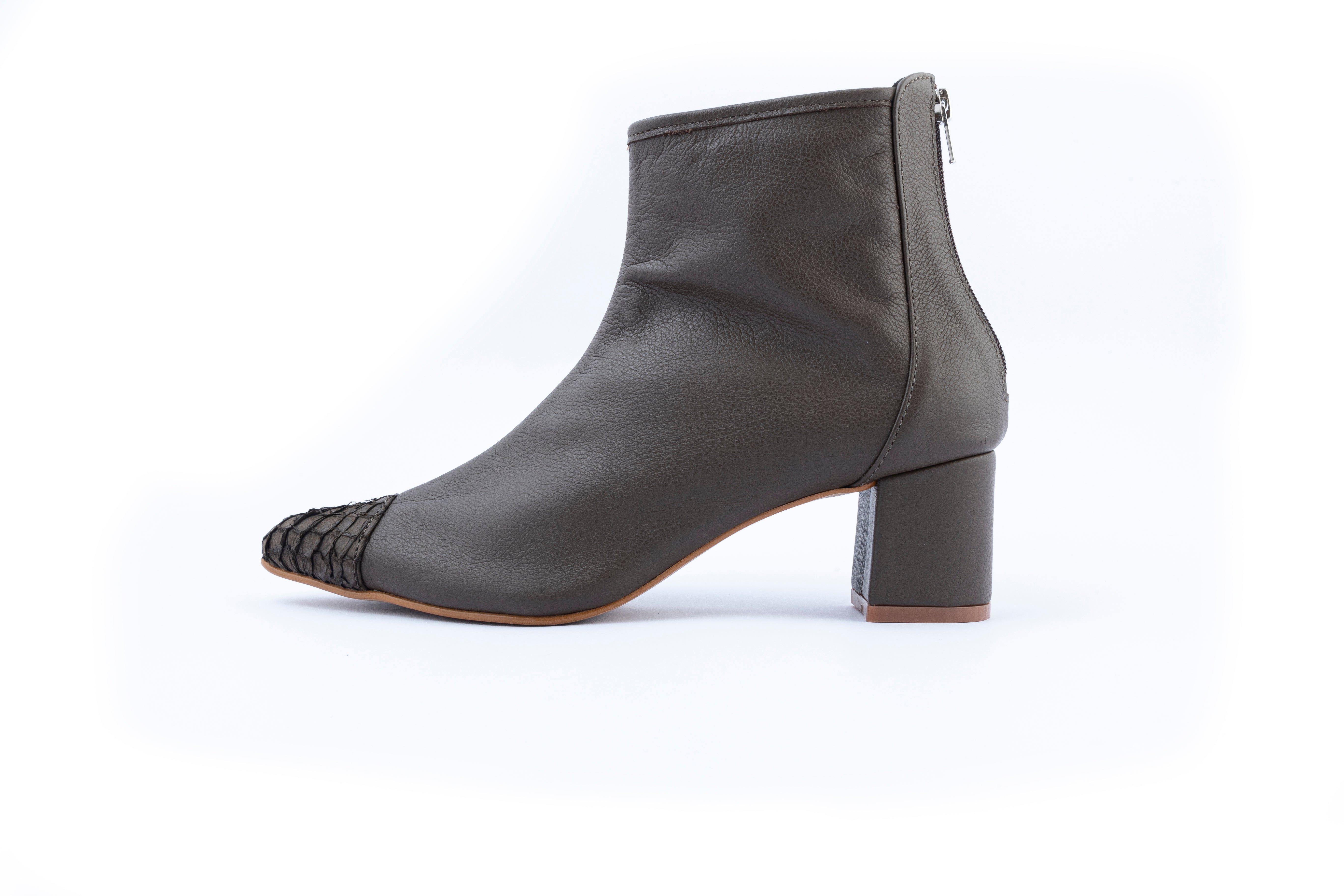 Bota em couro. Salto bloco médio e bico fino. Detalhes bico em Tilápia.