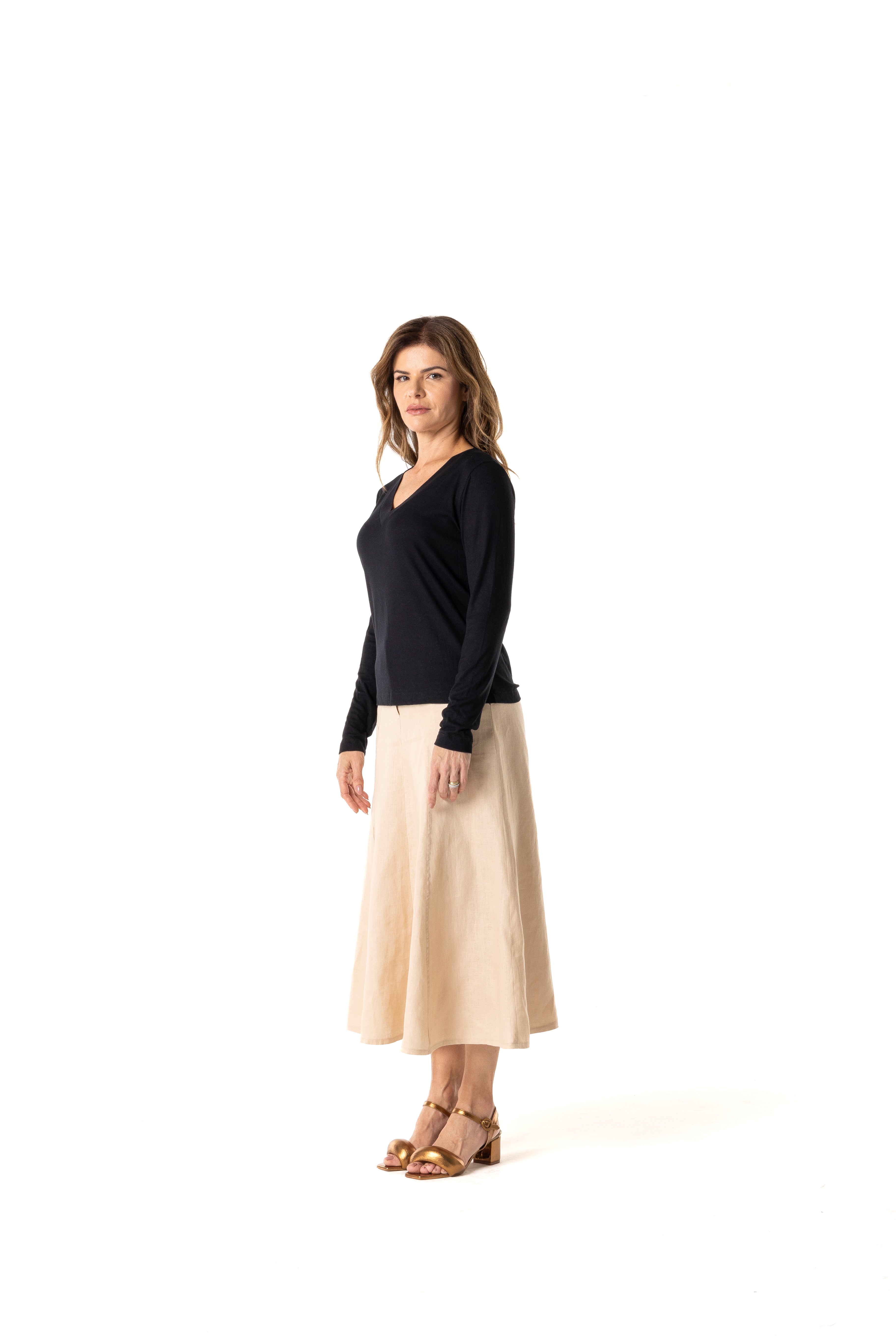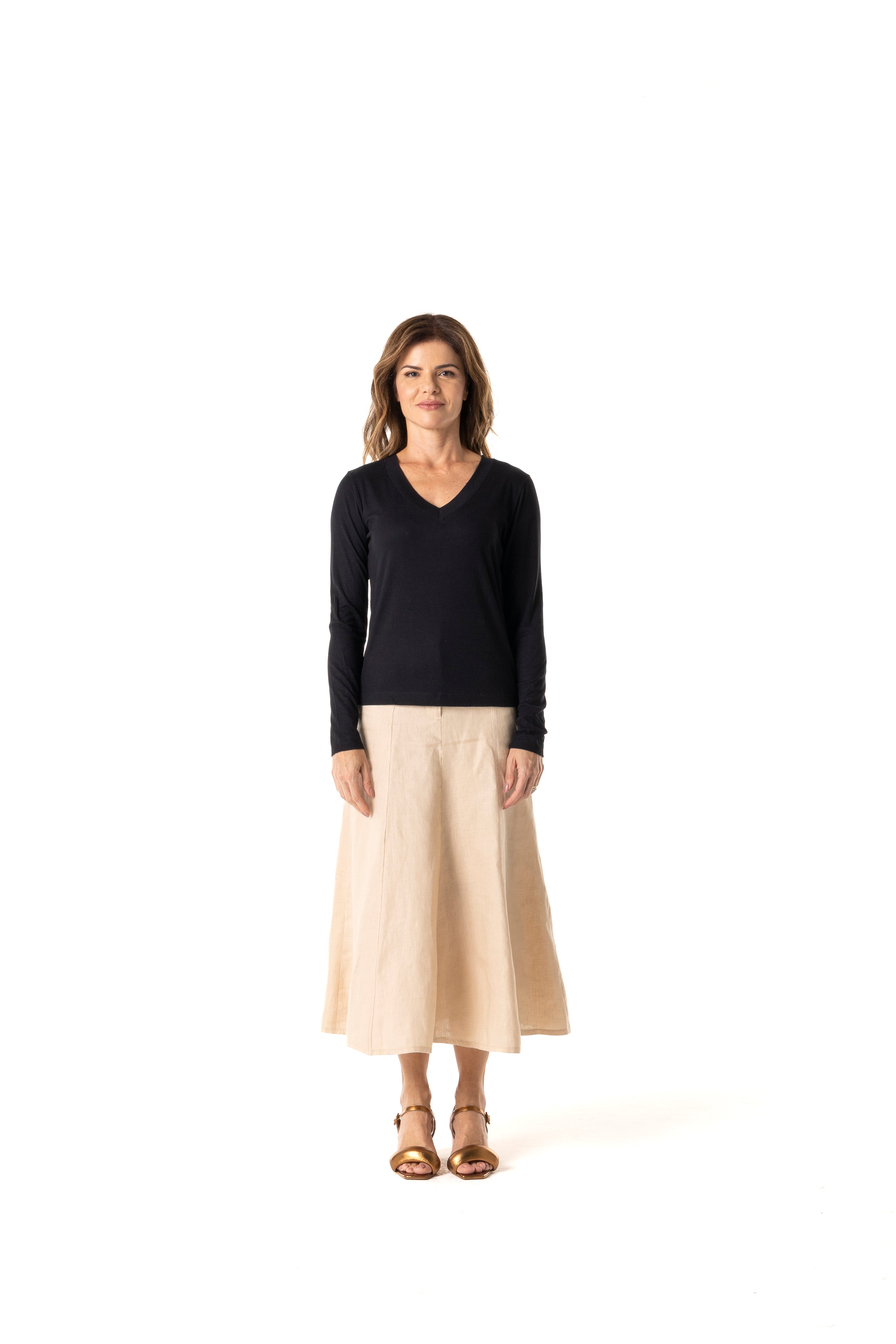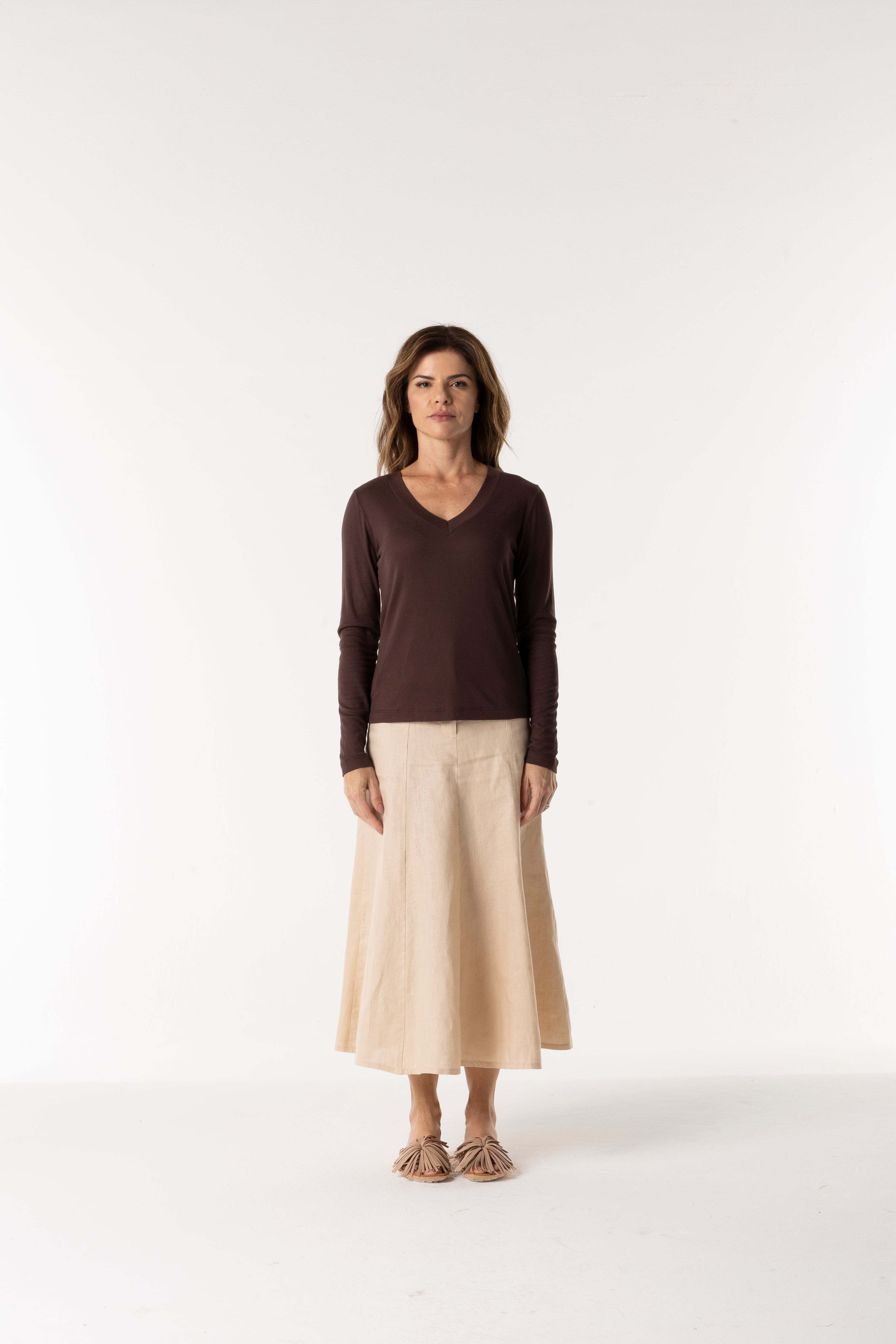 Camiseta em malha. Manga longa. Decote em V. Material 55% viscose e 45% acrílico.