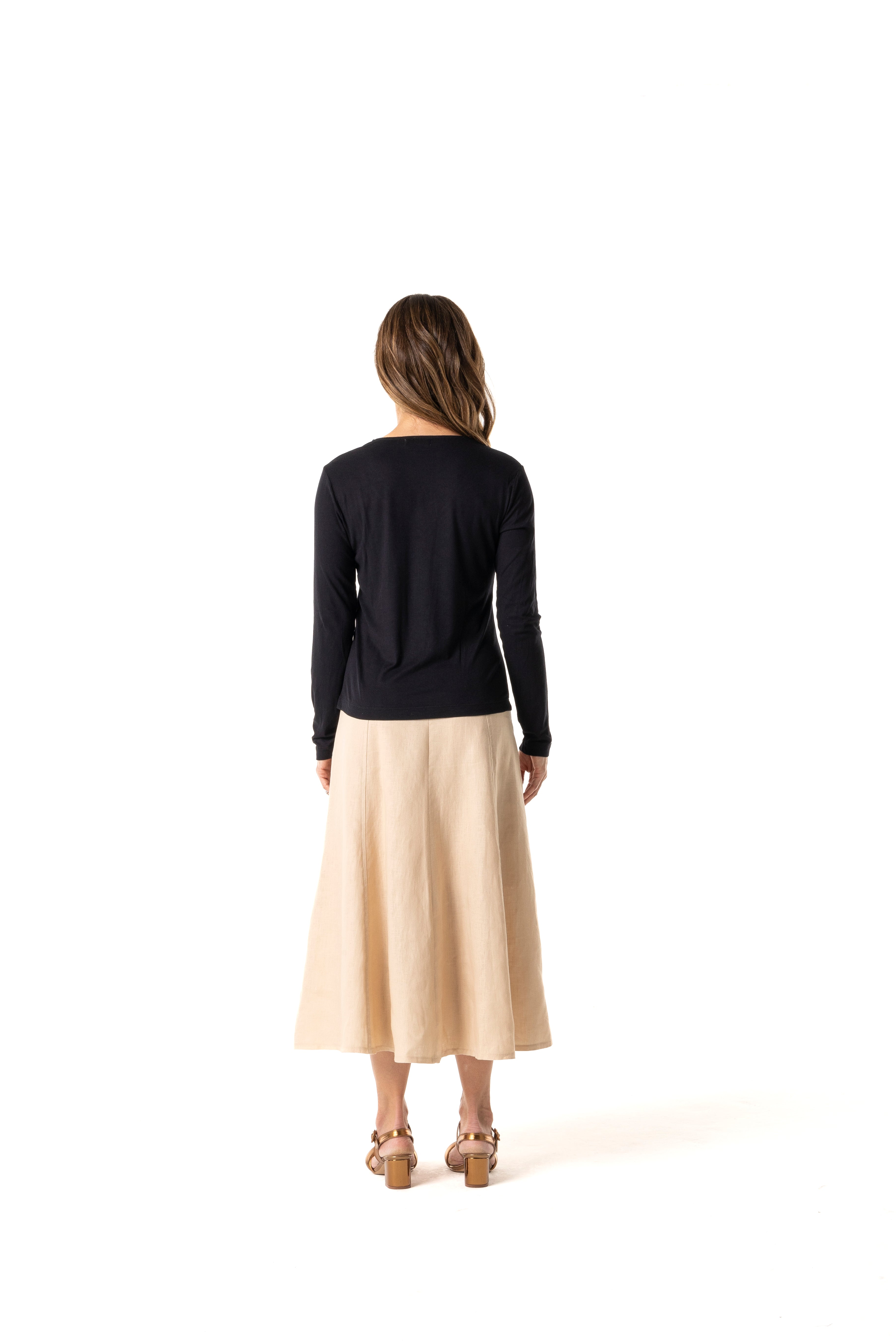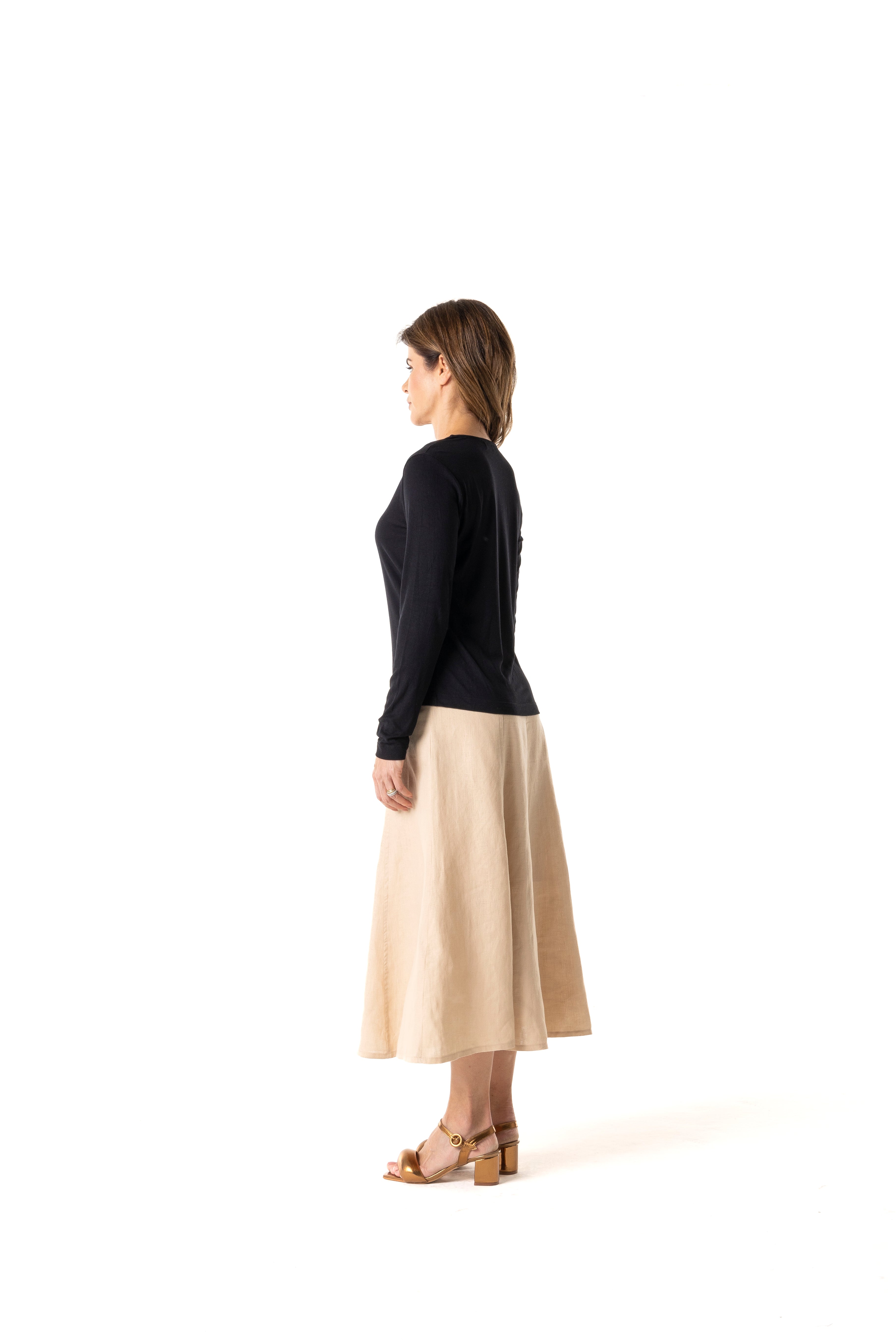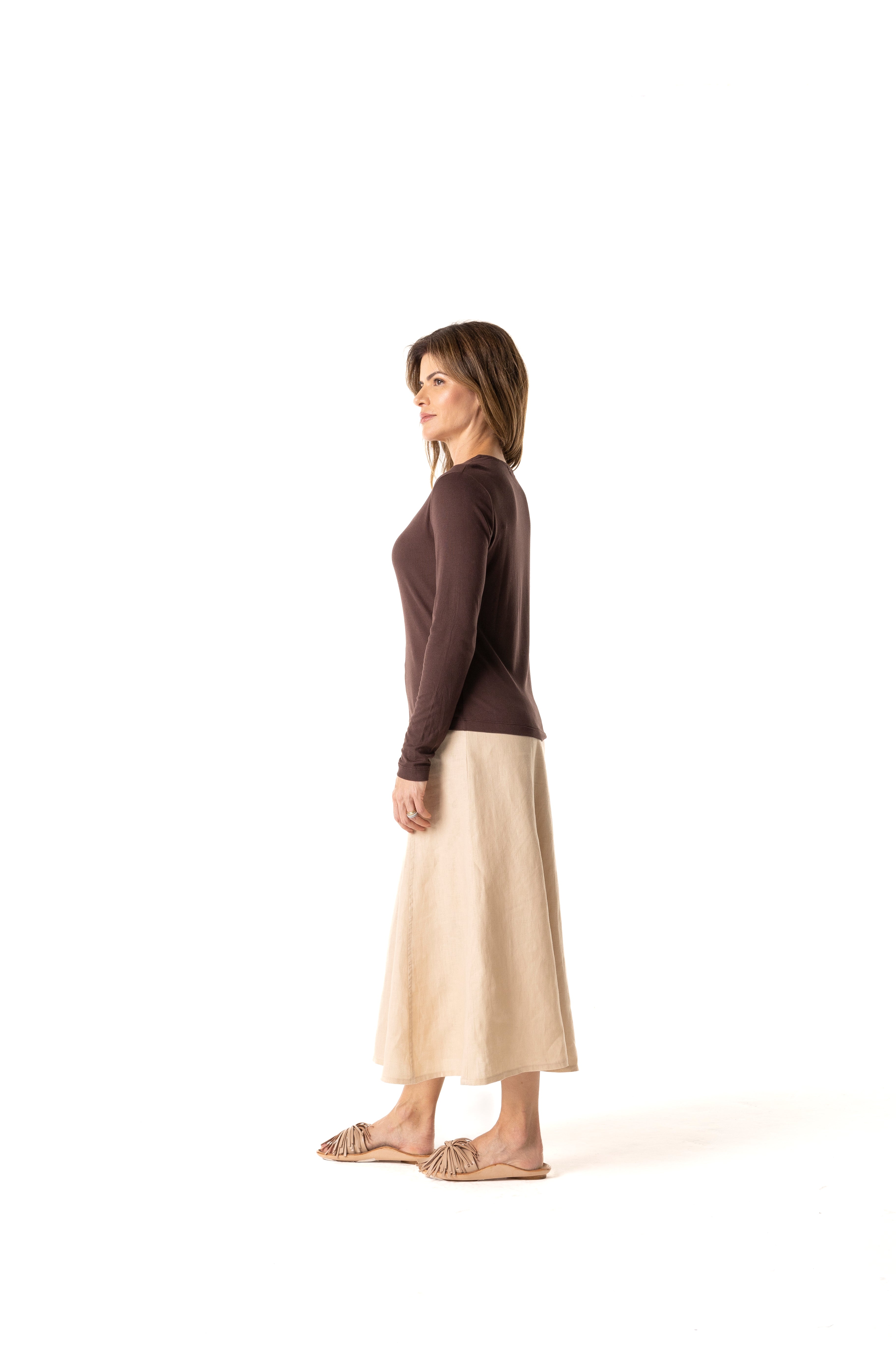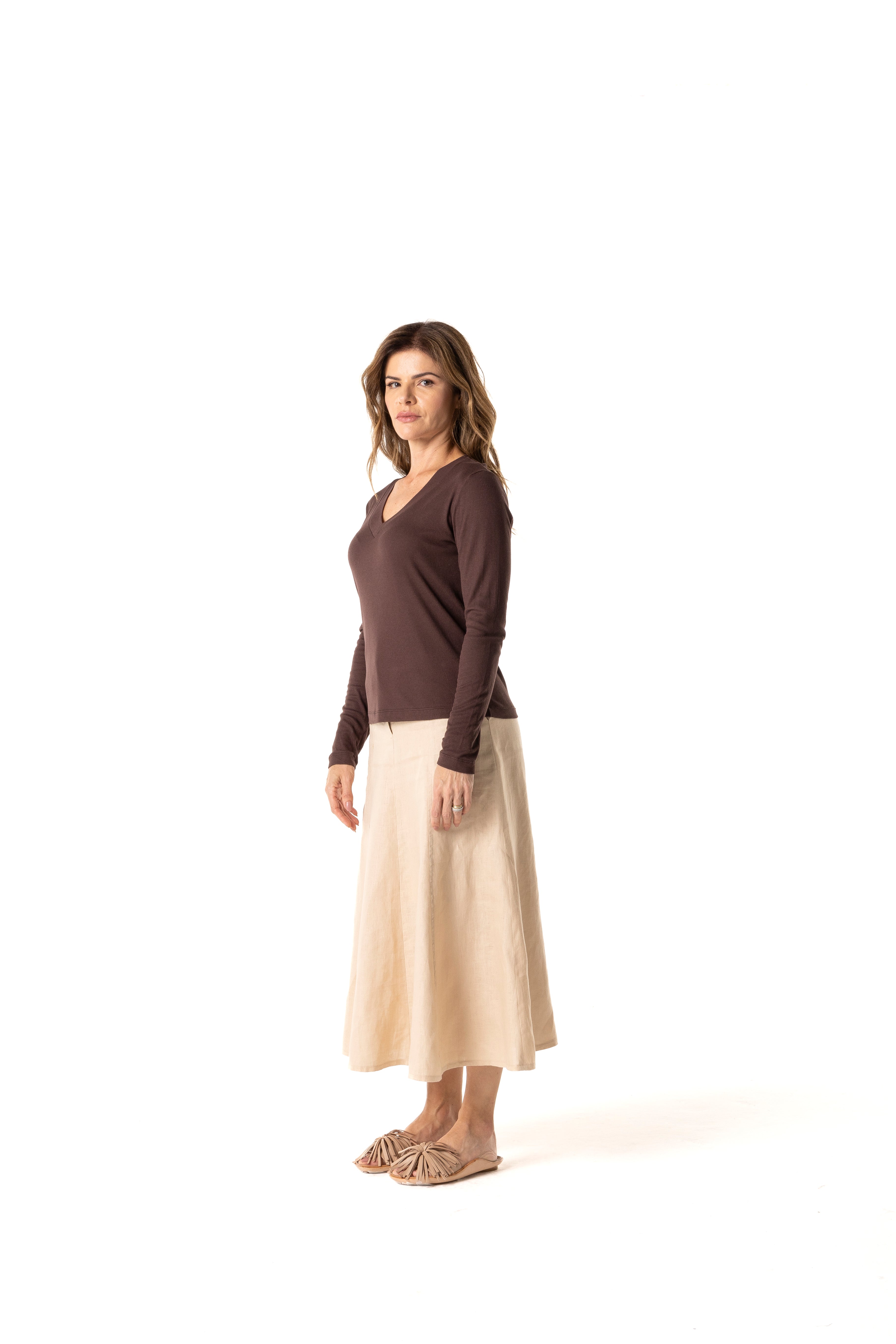 Camiseta em malha. Manga longa. Decote em V. Material 55% viscose e 45% acrílico.