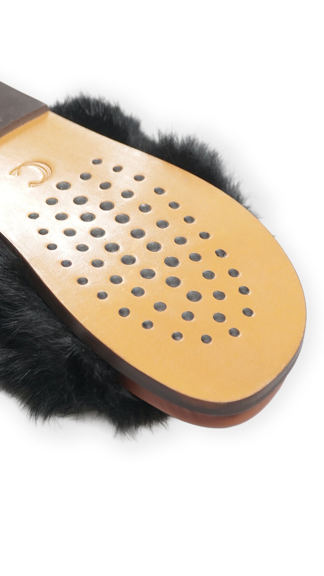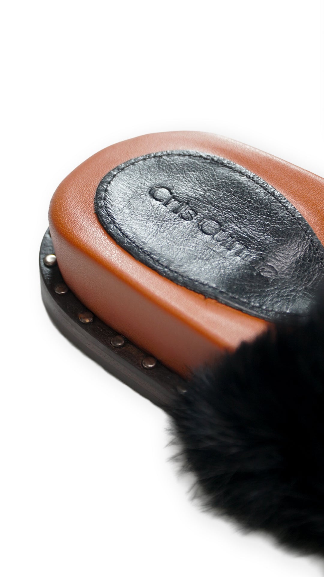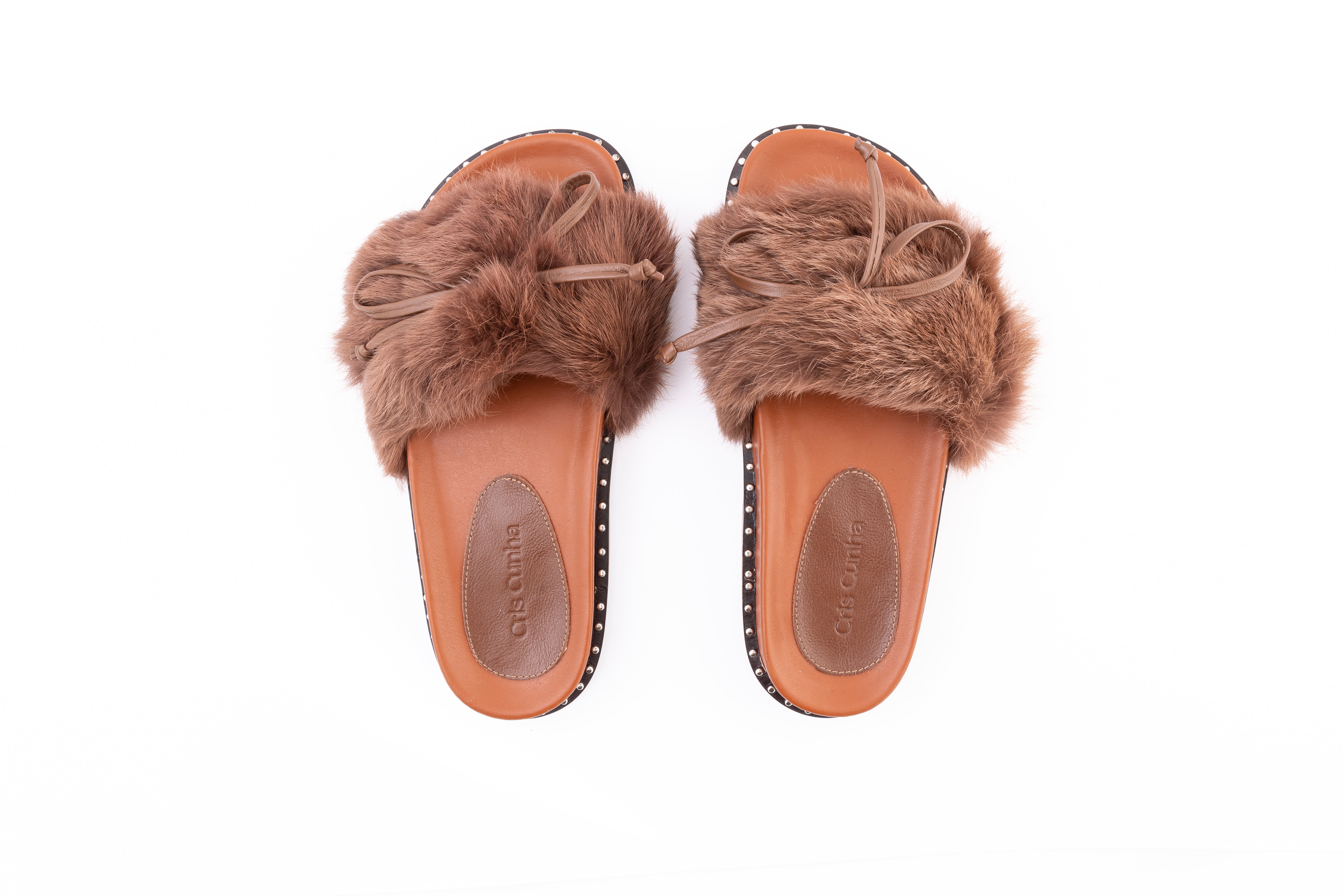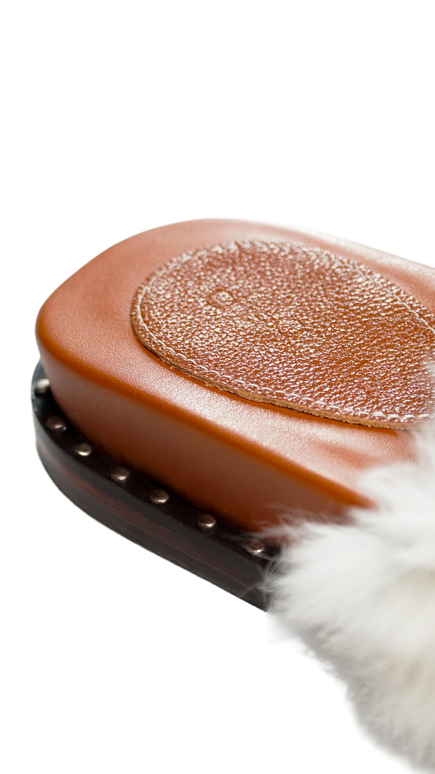 Papete forrada em couro com cabedal em pêlo e laço em couro. Solado em couro especial com...