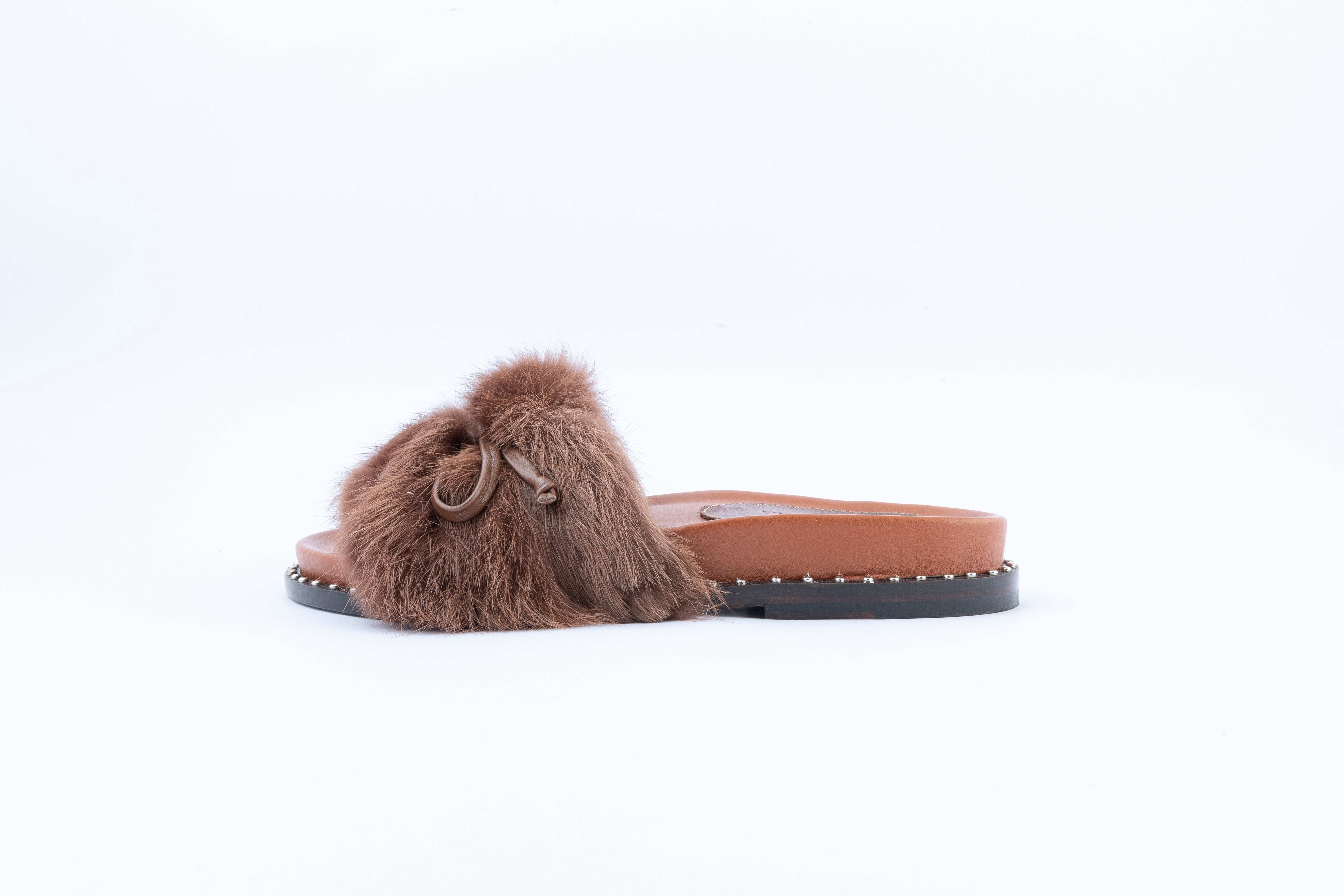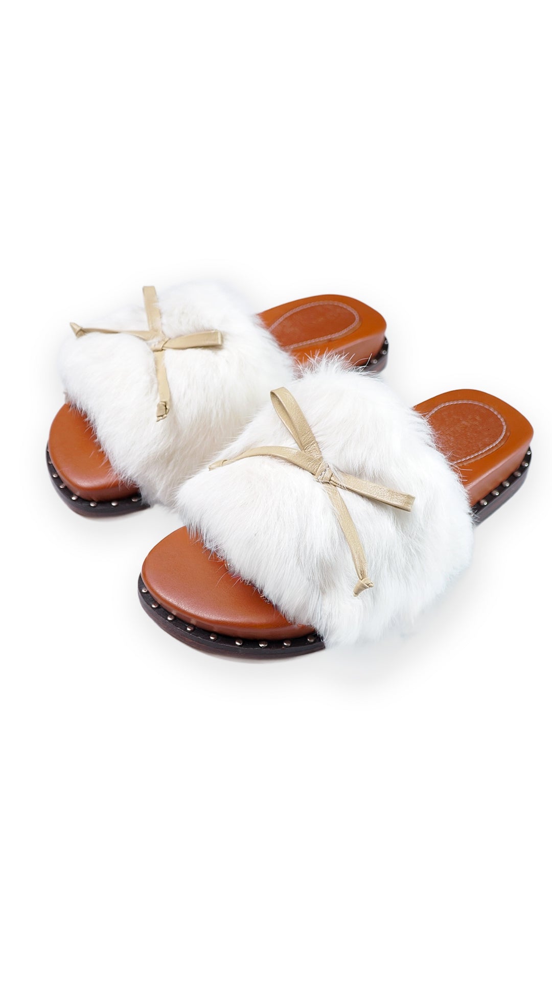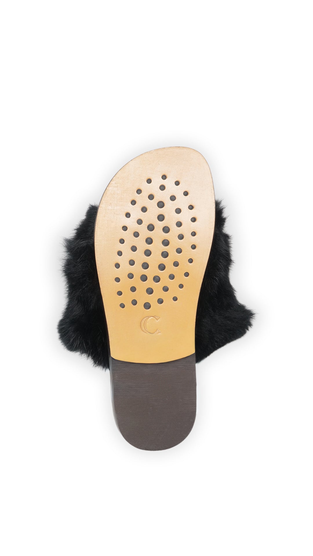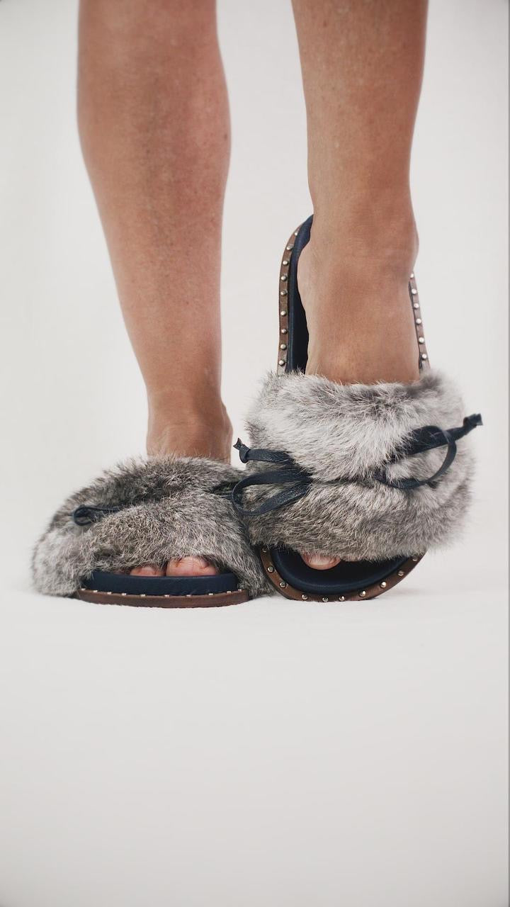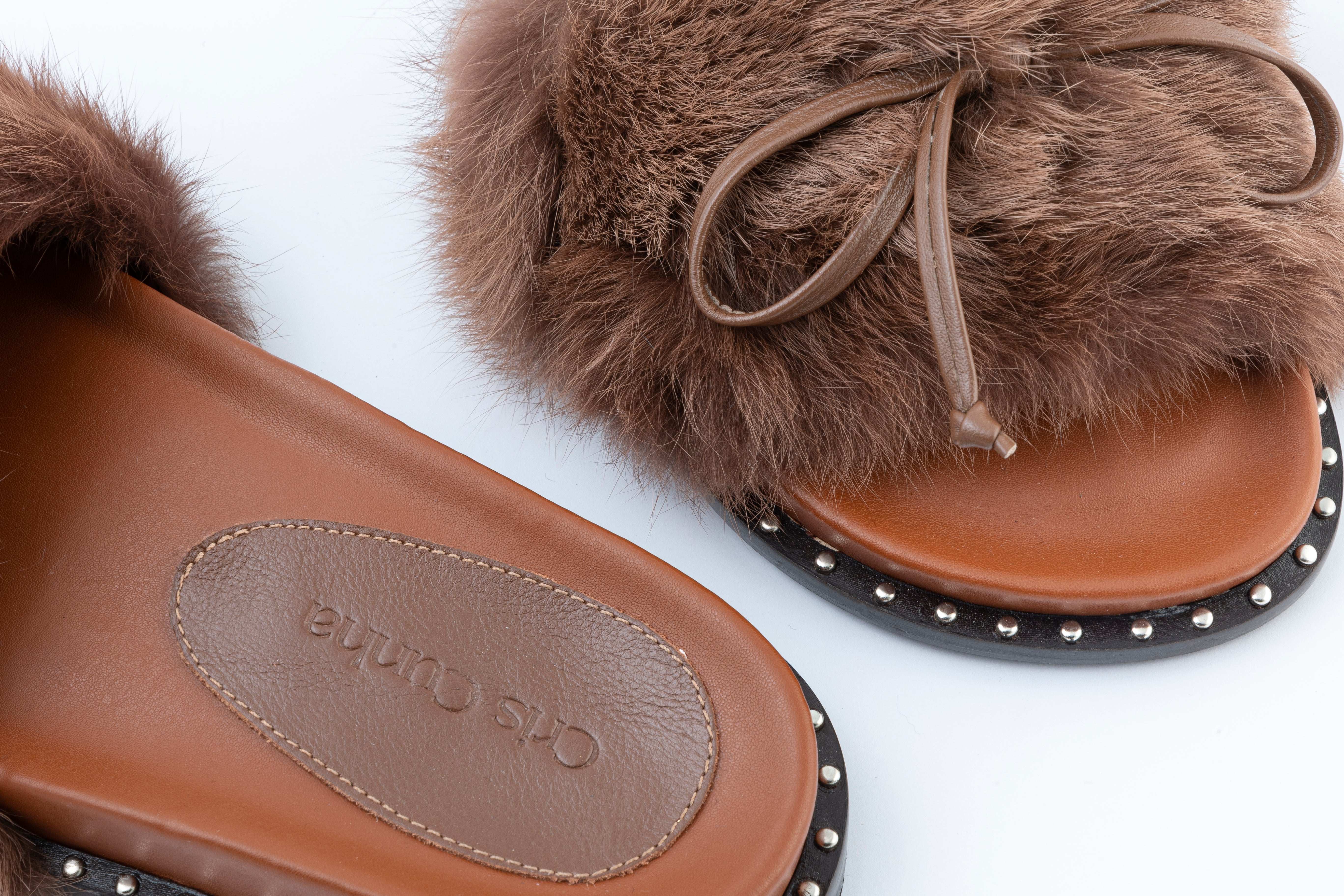 Papete forrada em couro com cabedal em pêlo e laço em couro. Solado em couro especial com...