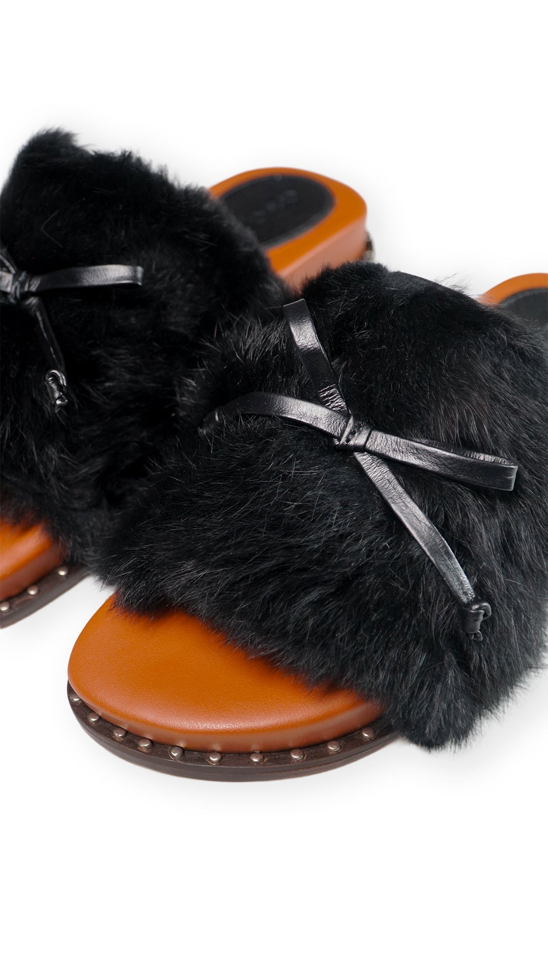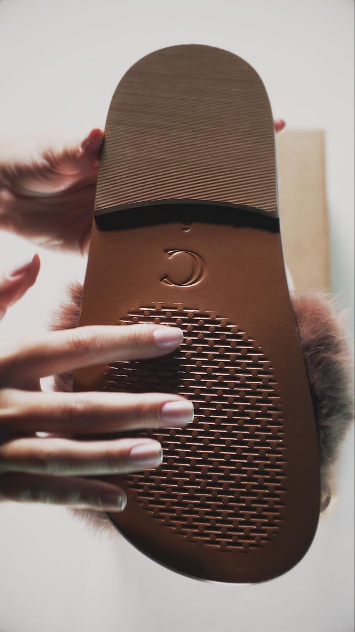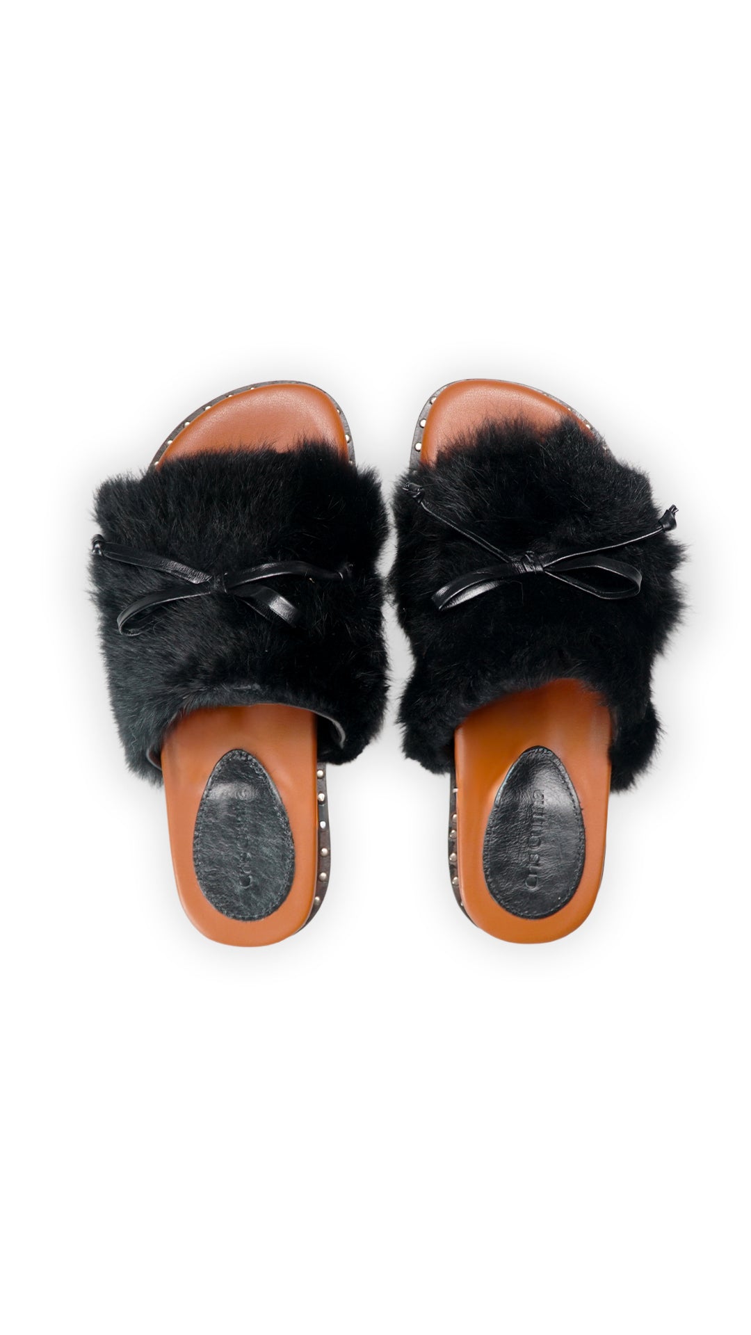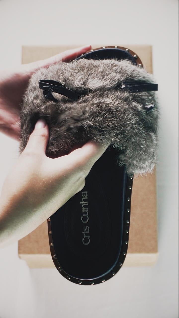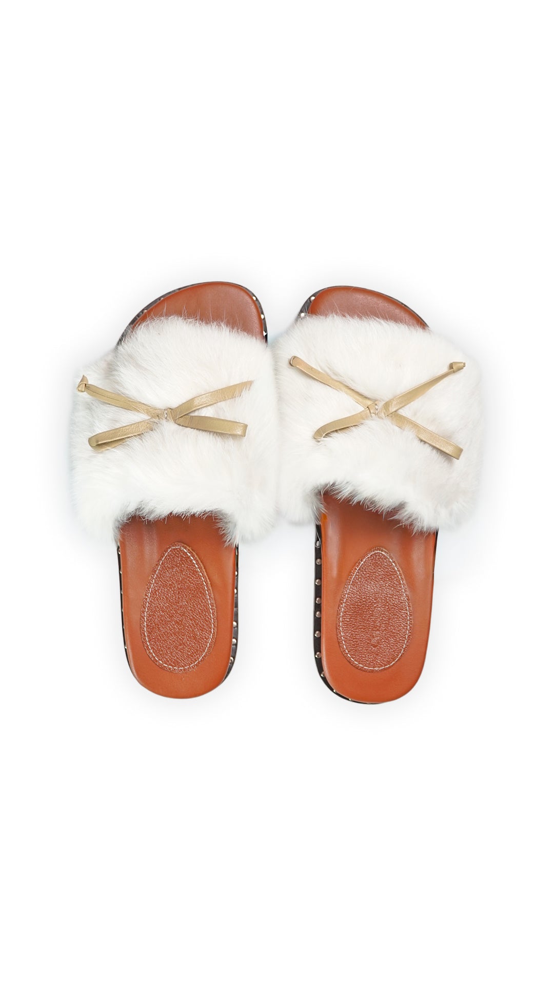 Papete forrada em couro com cabedal em pêlo e laço em couro. Solado em couro especial com...