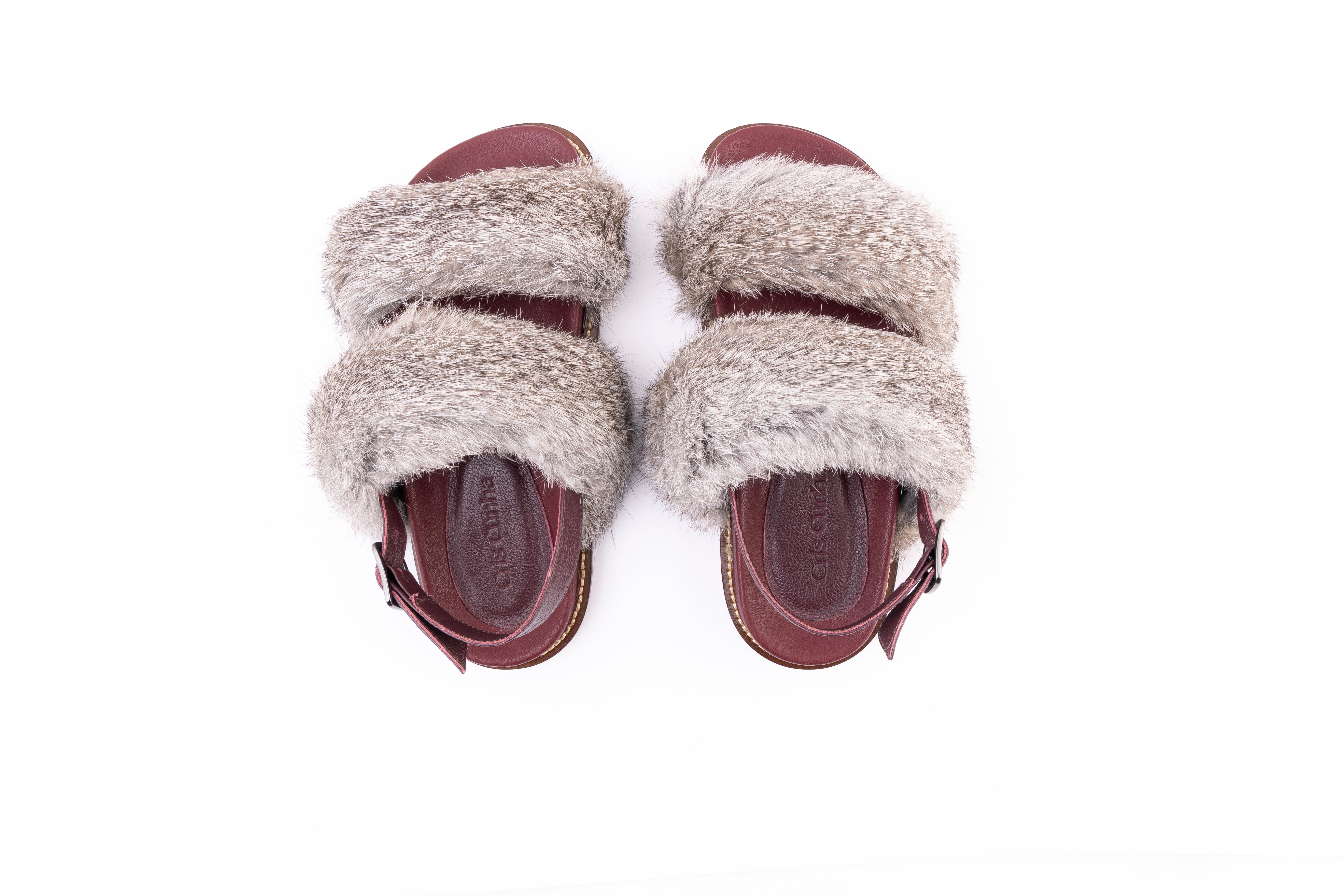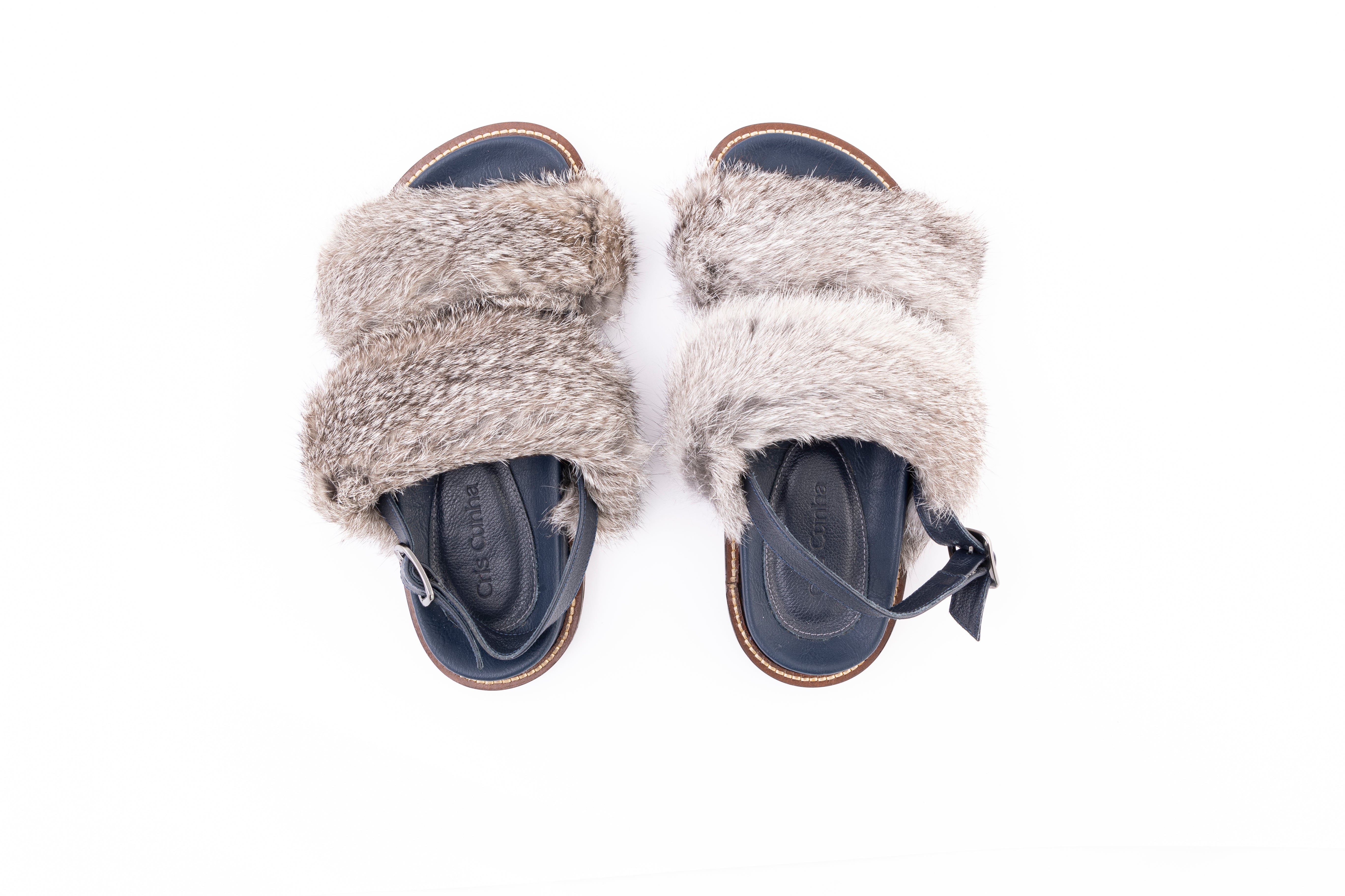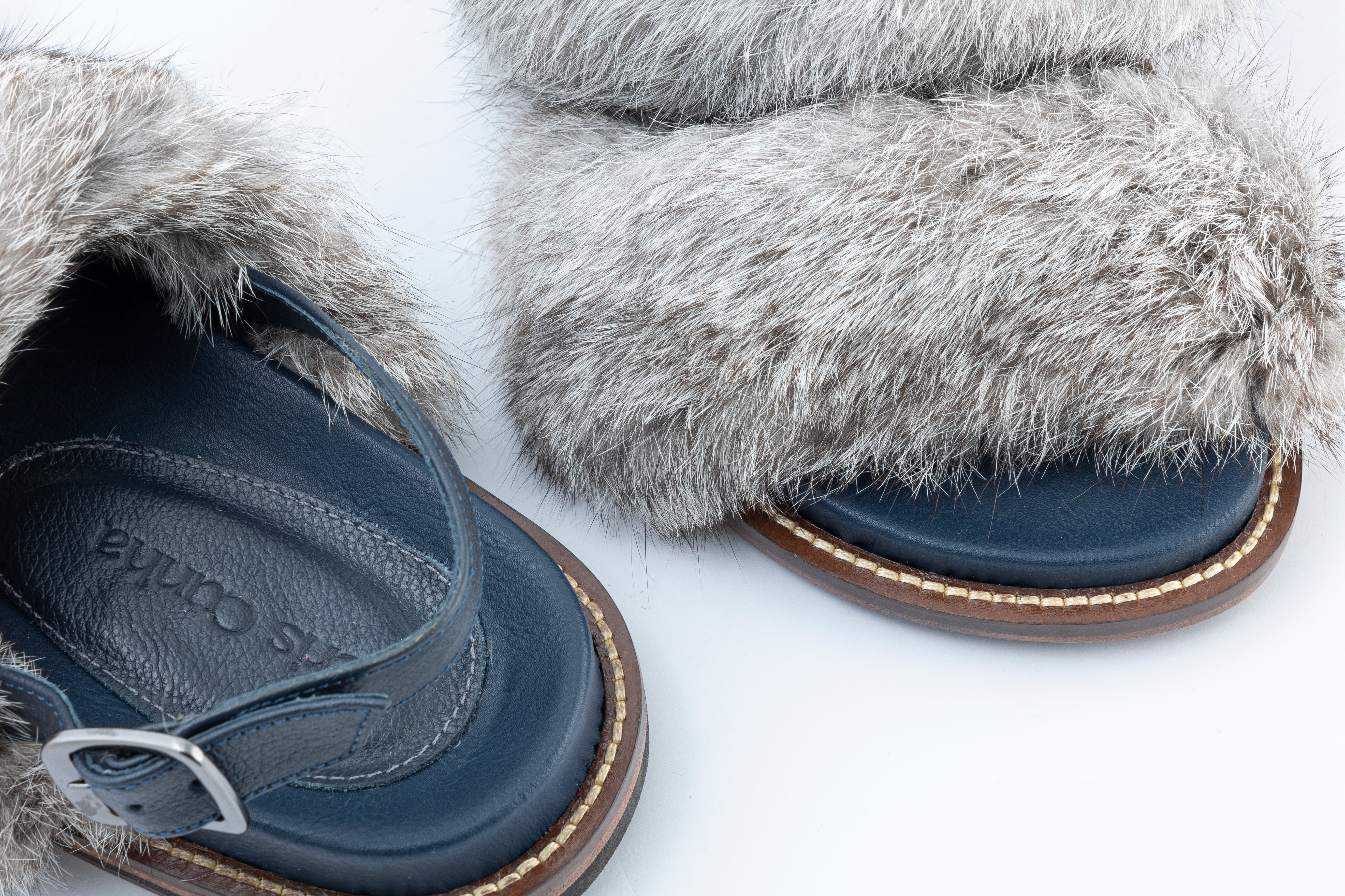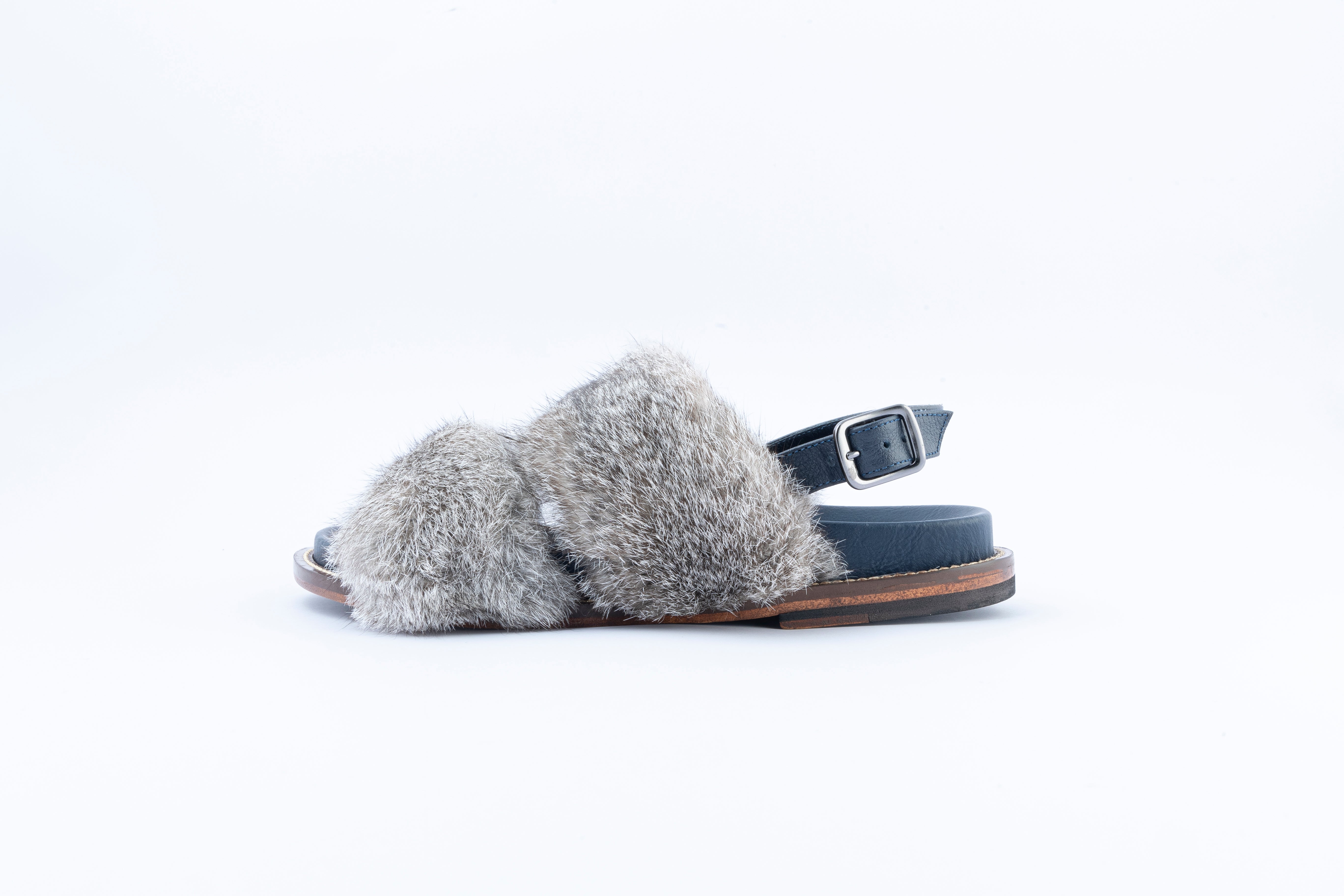 Papete forrada em couro com cabedal em pêlo cinza e tira traseira com fivela. Solado em couro...