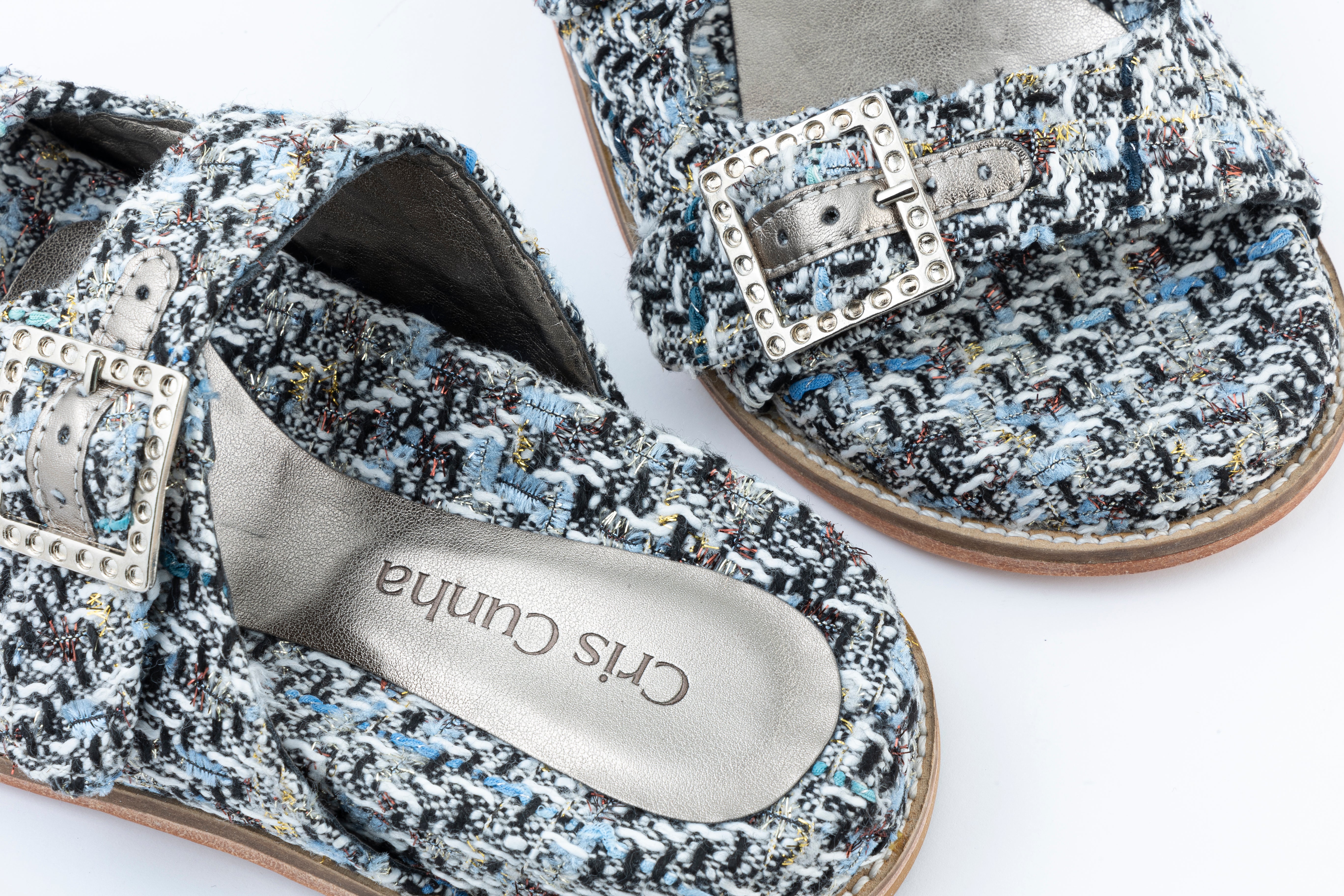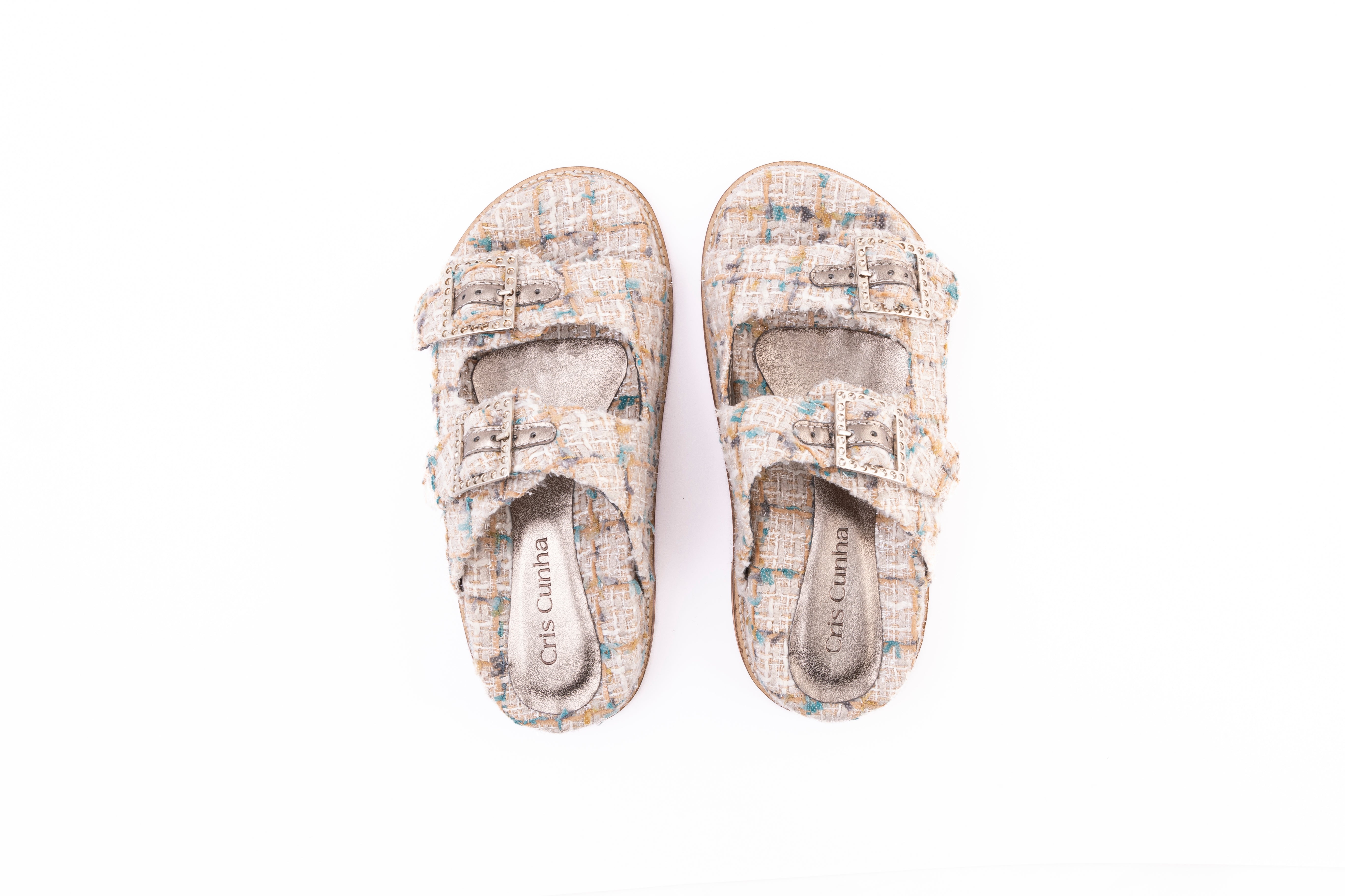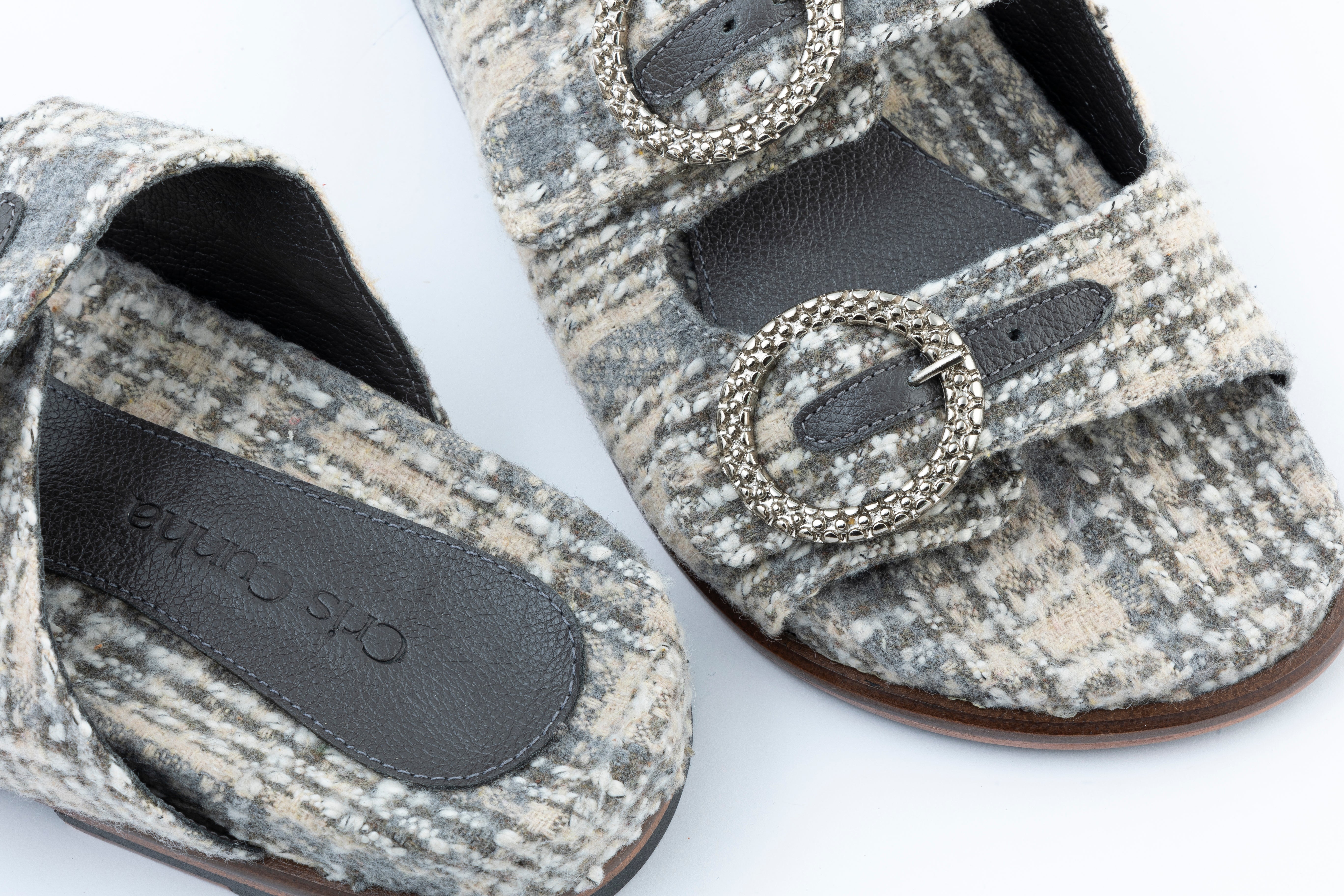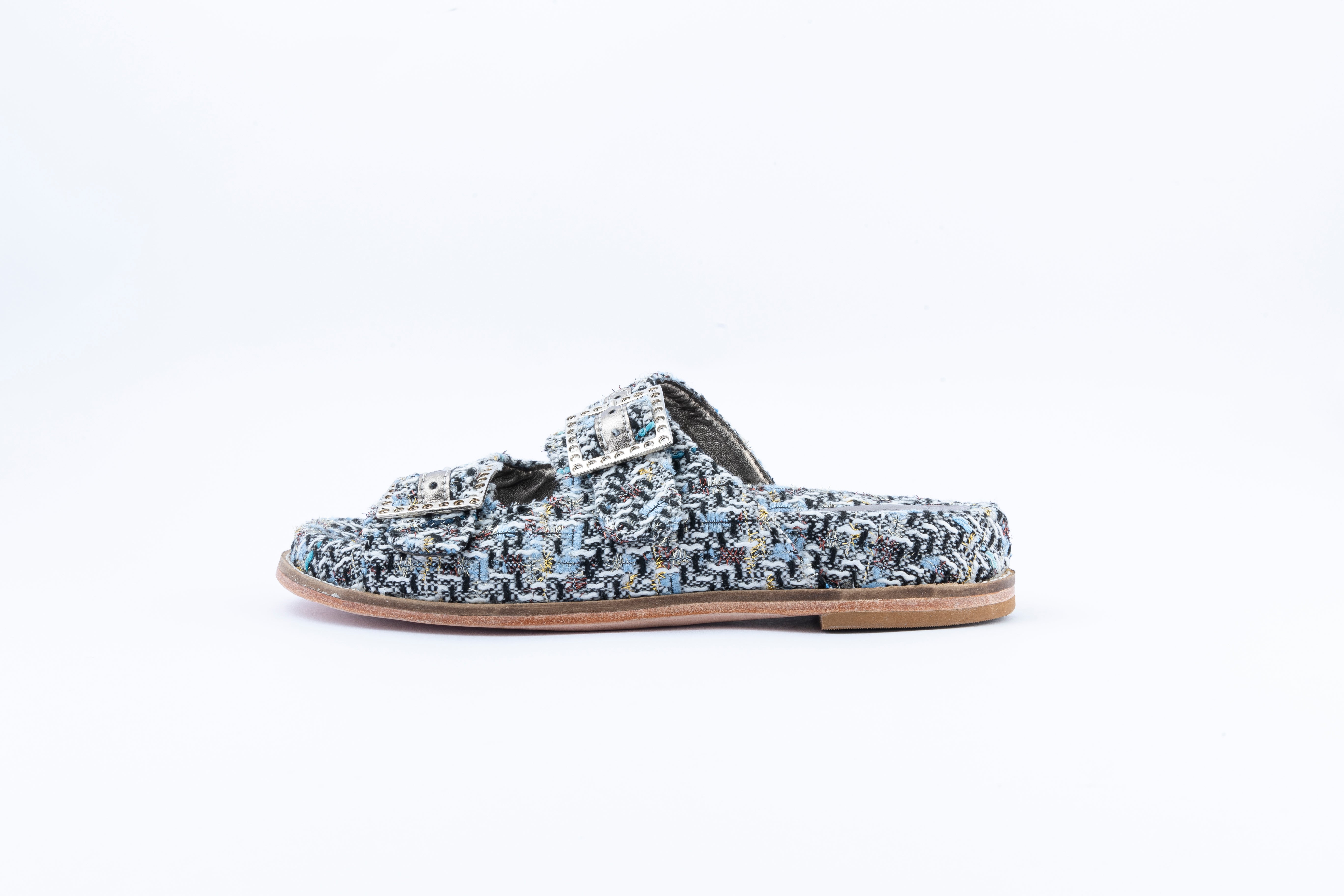 Papetes estilo Birkin toda forrada em Tweed importado, com detalhes em couro e fivela vintage prateada. Solado...